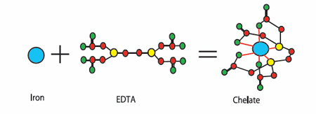 The word chelate is derived from the Greek word for "claw". In fertilizer technology, it refers to inorganic nutrients that are enclosed by an organic molecule. The example below shows how a nutrient such as iron combines with the chemical EDTA to form a chelate. The EDTA surrounds the inorganic iron and forms weak bonds with it, We ectively giving the nutrient an organic coating. Chelates are useful for micronutrients applied to alkaline soils. Iron, manganese, zinc and copper react with the ions found at high pH to form insoluble substances. As a result, the nutrients are made unavailable to plants. The organic coating in the chelate prevents these reactions from occurring in the soil. The plant roots take up the chelated nutrient and the chelate releases the nutrient within the plant. Chelated nutrients are also useful for foliar application. Plant leaves have a waxy coating that prevents them from drying. The wax repels water and inorganic substances making it di cult for inorganic nutrients to penetrate into the leaf. However, organic molecules can penetrate the wax.